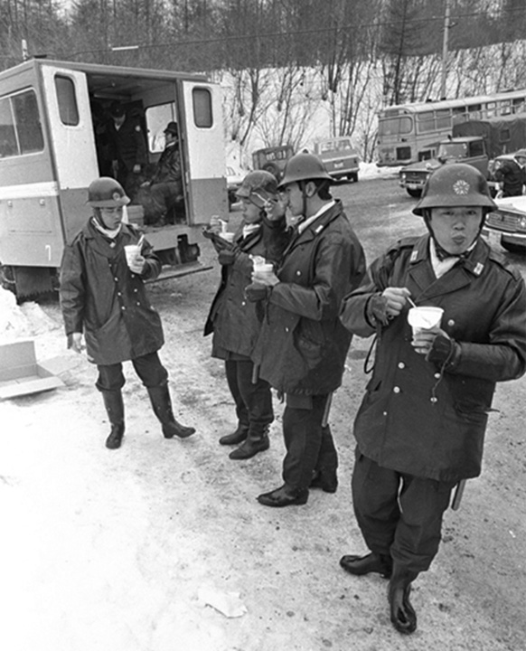 Members of the riot squad eating Cup Noodles (photo provided by Bungeishunju Ltd.)
