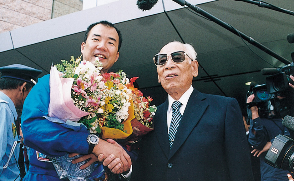 • Ando exchanging a firm handshake with astronaut Soichi Noguchi
