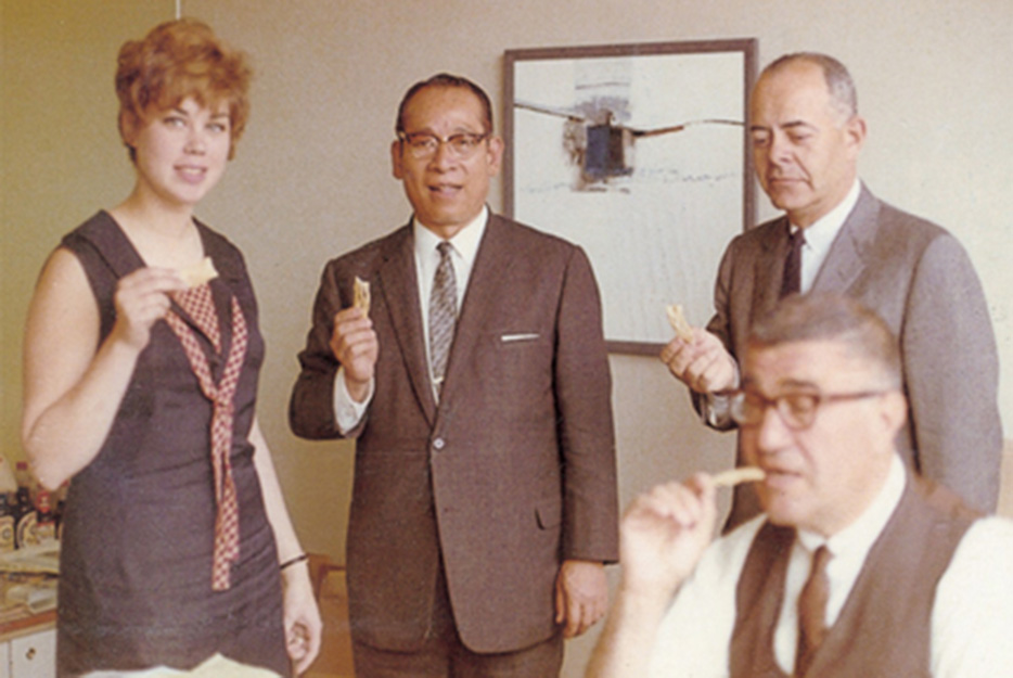 Ando wanted to spread Chicken Ramen worldwide, and in 1966 set out on an inspection trip to Europe and the U.S. During a visit with the buyers for a supermarket chain in the U.S., he saw the managers in the office divide up a block of Chicken Ramen noodles, place the noodles in paper cups, add hot water, and begin eating with forks. When they were done, they threw their cups in the wastebasket. This made Ando realize that paying close attention to differences in eating habits was the key to making instant noodles a global food. The experience gave Ando the hint that prompted development of a new product: noodles in a cup that can be eaten with a fork.