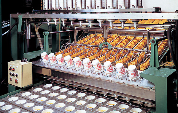 New product development began with preparation of a container. The ideal container that Ando had in mind would be sized and shaped suitably for holding in one hand. Following production and consideration of nearly forty prototypes, a container resembling an enlarged paper cup was adopted. The material selected for the container was polystyrene foam, which is lightweight, offers good heat insulation, and is highly economical. However, it was an unusual material in Japan at the time, and processing it in thin sheets and molding it into containers that fit in one hand was no easy task. Accordingly, Ando introduced an American technology and launched an in-house container production project. Although it took time to refine the quality to the point of producing an odorless container suitable for food products, in the end a cup that far surpassed U.S. Food and Drug Administration (FDA) quality standards was perfected.